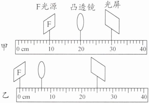 (2)小华将“F”光源、凸透镜和光屏按照图甲所示的位置放置时,光屏上能成清晰的像,所成的像是