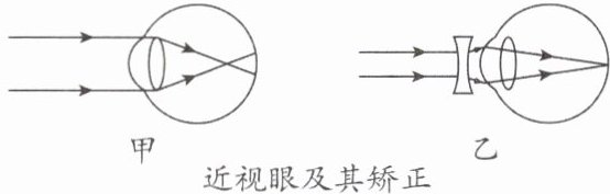 对于近视眼,由于晶状体太厚,折光能力太强,或者眼球在前后方向上太长,导致远处物体的像成在视网膜前方,所以看不清远处的物体,需要用对光线有发散作用的凹透镜来矫正,使像成在视网膜上。
