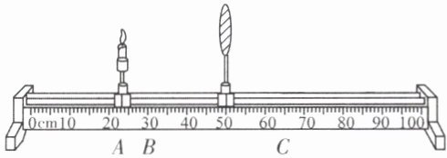 1. 蜡烛在A处时:由图可知,蜡烛在$20\ \text{cm}$刻度线处,凸透镜在$50\ \text{cm}$刻度线处,物距$u_A=50\ \text{cm}-20\ \text{cm}=30\ \text{cm}$。因为$u_A > 2f$($30\ \text{cm} > 20\ \text{cm}$),根据凸透镜成像规律,此时成倒立、缩小的实像,像距$f < v_A < 2f$,即$10\ \text{cm} < v_A < 20\ \text{cm}$。光屏在C处得到清晰像,所以光屏位置在$50\ \text{cm}+v_A$,即$60\ \text{cm} < C < 70\ \text{cm}$。