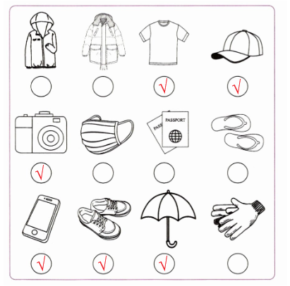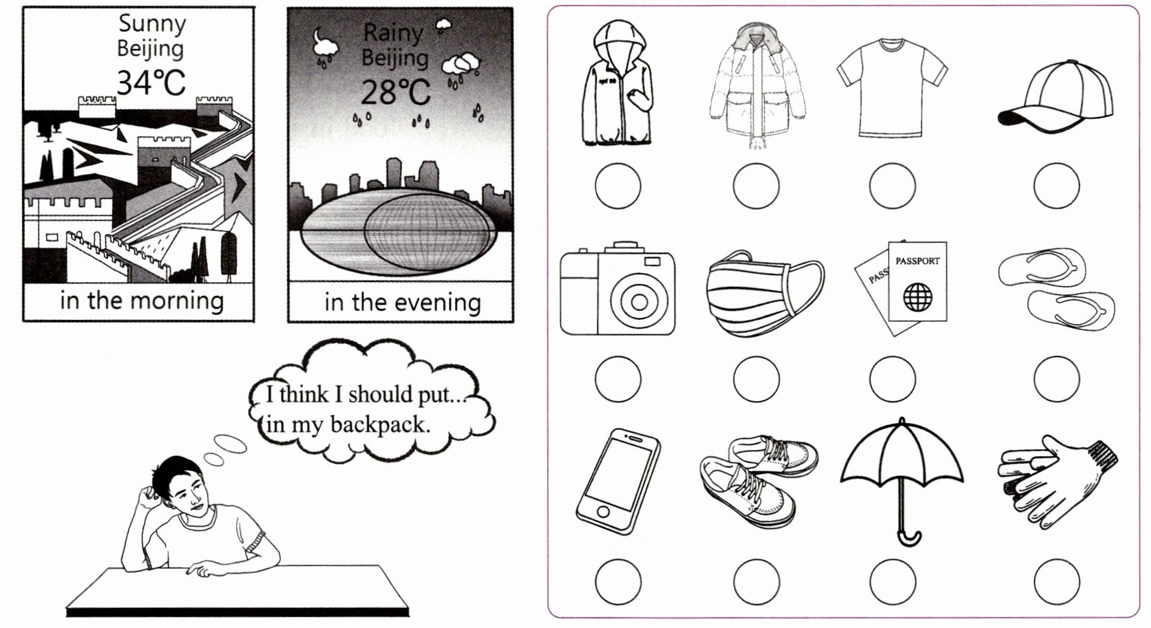 二、Max 正在挑选出游物品。请你根据天气图片并结合生活常识,帮 Max 挑选合适的物品,在相应的圆圈里打“√”。