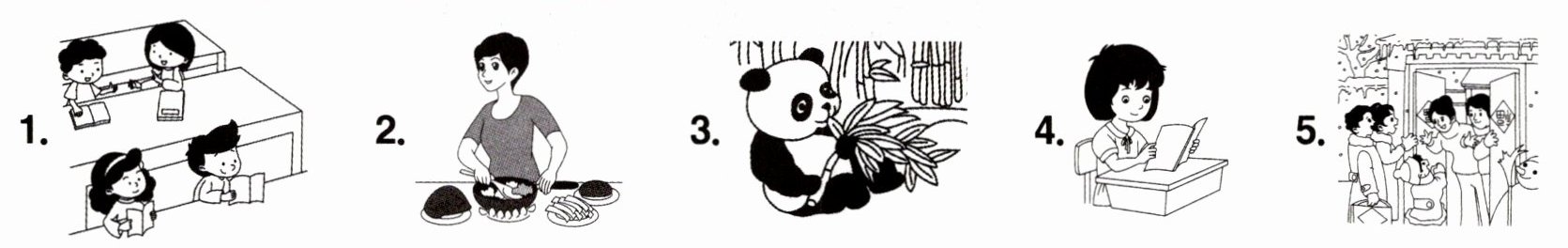 1. quietly 2. cooking 3. eating 4. reads 5. visit
