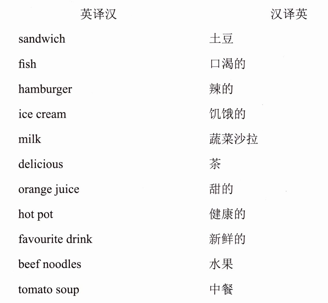 potato; thirsty; hot; hungry; salad; tea; sweet; healthy; fresh; fruit; Chinese food
