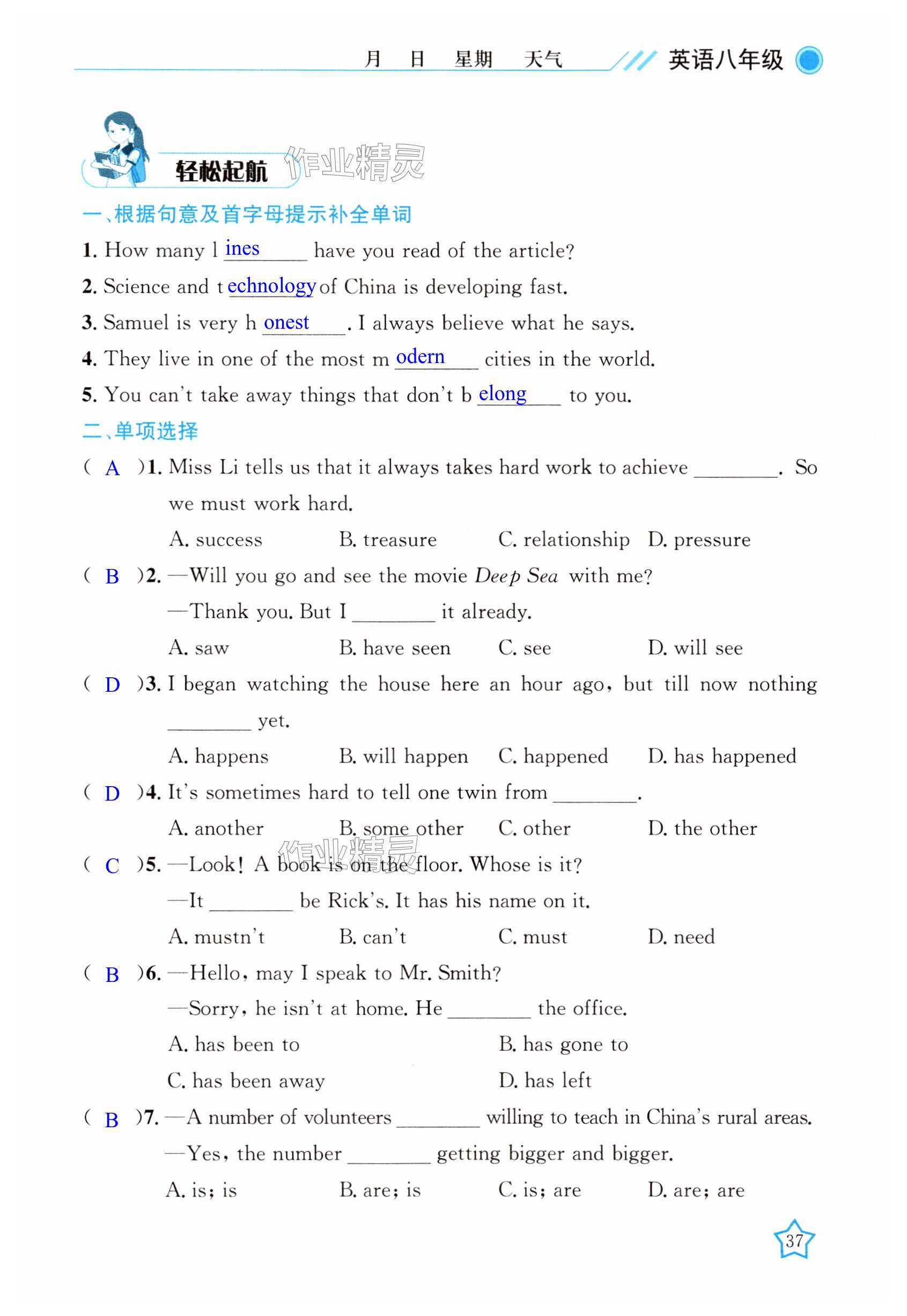 注:目前有些书本章节名称可能整理的还不是很完善,但都是按照顺序排列的,请同学们按照顺序仔细查找。练习册 2025年湘岳假期暑假作业八年级英语人教版 答案主要是用来给同学们做完题方便对答案用的,请勿直接抄袭。