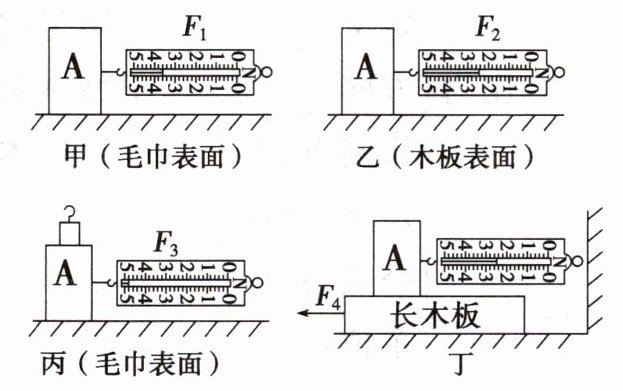 (3)小红对实验装置进行改进,如图丁所示,她用水平拉力$F_{4}= 4.0N$拉动长木板,待弹簧测力计示数稳定后,弹簧测力计的示数为2.5N,此时木块A受到的滑动摩擦力大小为____N,方向____;若增大拉力$F_{4}$,弹簧测力计的示数将____(填“变大”“不变”或“变小”)。小红对装置进行改进后的好处是____。