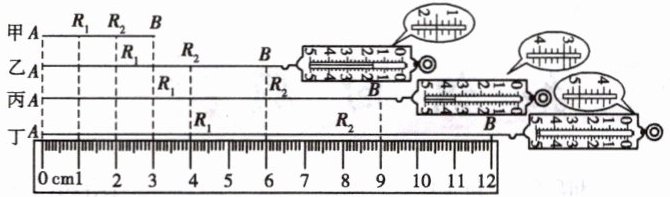 (3)当标识$R_{2}$刚好位于刻度尺上$7.00cm$位置时,$R_{1}$位于刻度尺上________cm位置。现手持细绳两端,$A$端向左$B$端向右使它们沿绳所在直线同时匀速运动,若发现标识$R_{2}$不动,则$A$、$B$两端的速度之比为________。