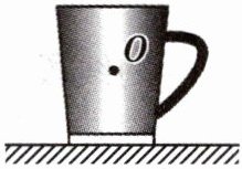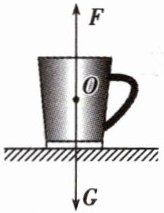 【解析】:杯子静止在水平面上,处于平衡状态,受到重力$G$和桌面的支持力$F$。重力方向竖直向下,支持力方向竖直向上,且这两个力大小相等、方向相反、作用在同一条直线上、作用在同一个物体上。从杯子的重心$O$点开始,分别沿竖直向下和竖直向上的方向画带箭头的线段表示重力$G$和支持力$F$。