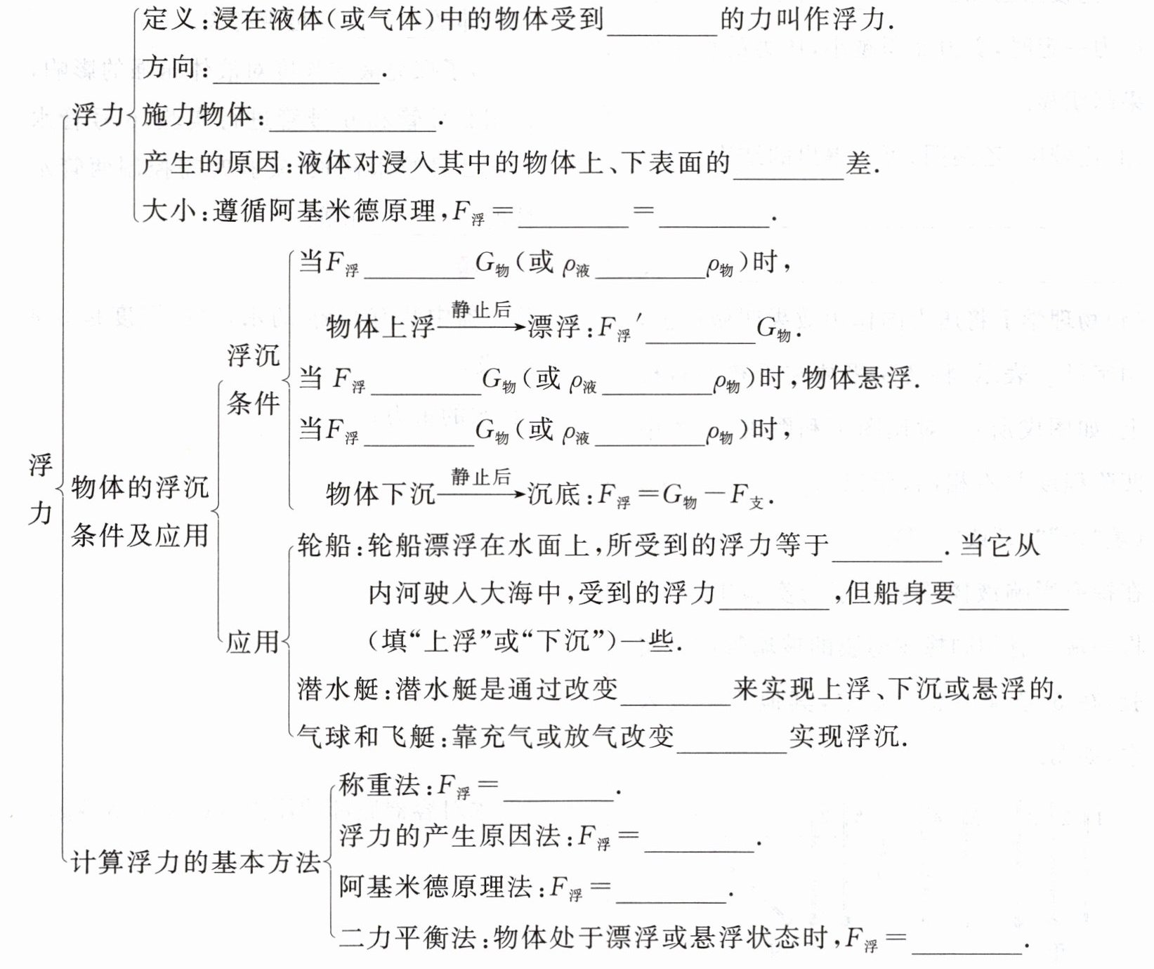 故答案依次为:向上;竖直向上;液体(或气体);压力;$G_{排}$;$\rho_{液}gV_{排}$;$>$;$>$;$=$;$=$;$<$;$<$;重力;不变;上浮;自身重力;体积;$G - F_{示}$;$F_{向上}-F_{向下}$;$G_{排}=\rho_{液}gV_{排}$;$G_{物}$。