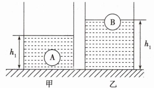 5. 如图所示,两个相同的圆柱形容器放在水平桌面上,分别装有甲、乙两种不同的液体。将体积相同、密度不同的实心球A、B分别放入容器中静止时,A球悬浮,B球漂浮,$h_{1}\lt h_{2}$,且两种液体对容器底的压强相等,下列说法正确的是()