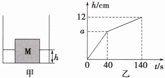 13. 如图甲所示,一个棱长为$10cm$、重为$9N$的正方体物块M,水平放置在一个方形容器中,M与容器底部不密合。以恒定水流向容器内注水,容器中水的深度$h随时间t$的变化关系如图乙所示,当$t = 100s$时,物块M在水中处于______(填“沉底”“悬浮”或“漂浮”)状态,图乙中$a$的值为______$cm$($g = 10N/kg$)。