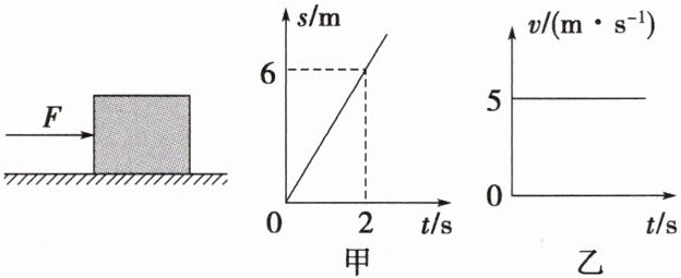 1. 物体在同一水平面上做匀速直线运动,当物体运动路程与时间的关系图像如图甲时,受到的水平推力为$F_{1}$;当物体运动的速度与时间的关系图像如图乙时,受到的水平推力为$F_{2}$。两次推力的功率分别为$P_{1}$、$P_{2}$。则$F_{1}:F_{2}和P_{1}:P_{2}$分别为()