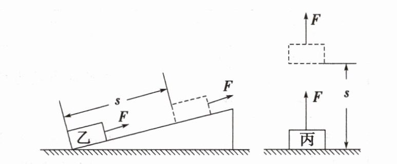 **例1** 现有甲、乙、丙三个质量不同的物体($m_{甲} > m_{乙} > m_{丙}$),在相等的恒力$F$作用下,分别在水平方向、沿斜面向上、竖直方向通过了相等的距离$s$,如图所示。$F$在三种情况下做的功分别为$W_{甲}$、$W_{乙}$、$W_{丙}$,下列正确的是( )