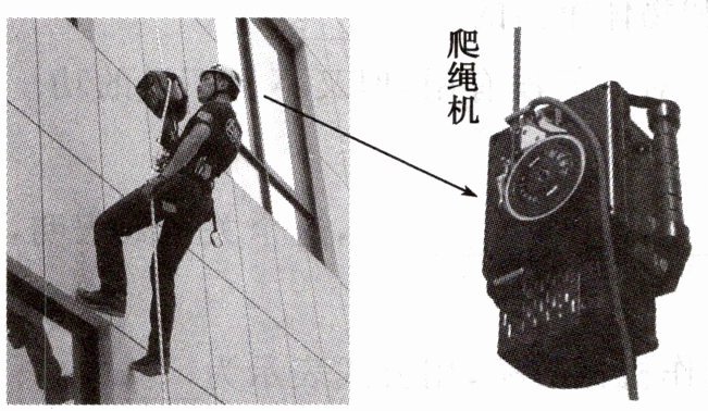 15. 如图是一款爬绳机,这款爬绳机可以不消耗人的体能,轻松攀爬、下降,可用于消防救援、矿井救援及桥梁检测维修等等。爬绳机的质量为$10kg$,静止在水平地面上时与地面的接触面积为$0.1m^{2}$。在某次爬升中,将一个质量为$70kg的工人从地面匀速提升12m$高,用时$1min$。($g取10N/kg$)求: