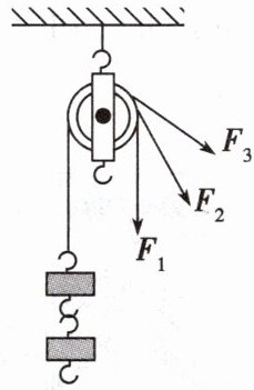 6. 如图所示,用一根绳子绕过定滑轮,一端拴在钩码上,手执另一端,分别用力$F_{1}$、$F_{2}$、$F_{3}$匀速拉起钩码。忽略绳子与滑轮的摩擦,下列说法正确的是()