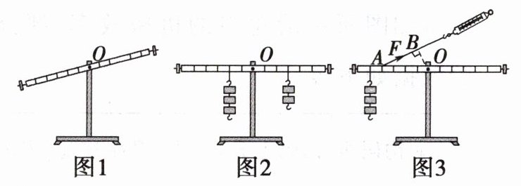 (4)某小组对实验过程交流、讨论后,按图3所示又进行了实验。老师肯定了他们的做法,并指出,用弹簧测力计斜拉可使结论更具普遍性,因为这样做改变了____。在测量拉力$F$的力臂时,小组内有不同的意见,你认为拉力的力臂应为____(填“$OA$”“$OB$”或“$AB$”)。