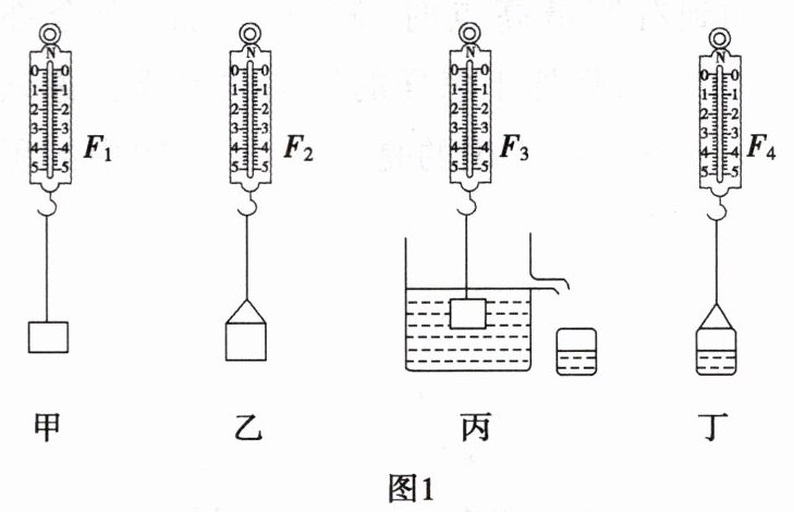 (1)实验步骤如图1所示,甲、乙、丙、丁中的弹簧测力计的示数分别为$F_{1}$、$F_{2}$、$F_{3}$、$F_{4}$,物体受到的浮力$F_{浮}= $______。