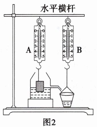 (4)小张利用身边的器材对小李的实验进行改进:两个相同的弹簧测力计A和B、重物、溢水杯(由饮料瓶和吸管组成)、薄塑料杯(质量忽略不计)等器材,装置如图2所示。实验时小张逐渐向下移动水平横杆,使重物缓慢浸入盛满水的溢水杯中,观察到弹簧测力计A的示数逐渐______,弹簧测力计B的示数逐渐______,若弹簧测力计A的示数变化量为$\Delta F_{A}$,弹簧测力计B的示数变化量为$\Delta F_{B}$,则它们的大小关系是$\Delta F_{A}$______(填“$>$”“$=$”或“$<$”)$\Delta F_{B}$。
