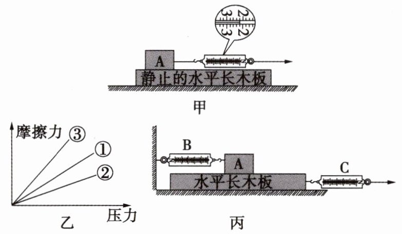 (3)如图丙所示改进实验,用弹簧测力计C水平拉动长木板,当物块A相对地面静止且长木板刚好做匀速直线运动时,物块A受到的滑动摩擦力大小等于弹簧测力计______(填“B”或“C”)的示数。