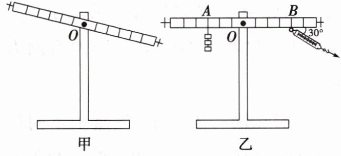(3)在完成实验后,陶子同学在A处挂了3个钩码(每个钩码重1N,杠杆上每格的长度为10cm),如图乙所示,他将弹簧测力计斜向下拉,杠杆水平平衡($OA = 30cm$,$OB = 40cm$),此时拉力与水平方向的夹角为$30^{\circ}$,则弹簧测力计的示数为______N。