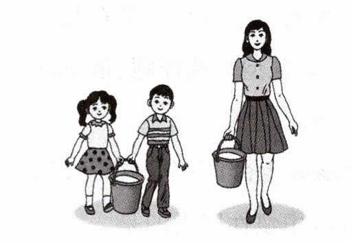 **例6** 如图所示,两个小孩能拎起一桶水,一个大人也能拎起同一桶水。由此可知,一个大人的作用力产生的效果跟两个小孩共同作用产生的效果____,大人的作用力相当于____(填“合力”或“分力”),每个小孩的作用力相当于____(填“合力”或“分力”)。