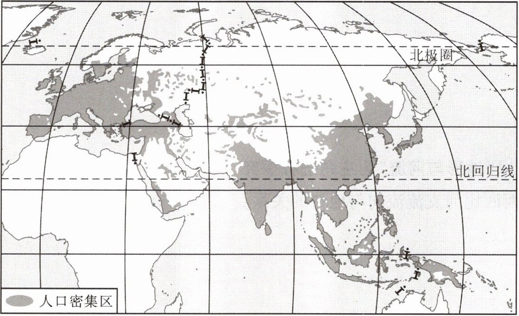 (2) 示例:圈出亚洲东部(人口稠密区),成因:自然条件优越(气候温暖湿润,地形平坦,土壤肥沃,水源充足);农业发展历史悠久,工业、交通、城市发展迅速。(或圈出亚洲北部(人口稀疏区),成因:纬度高,气候寒冷,自然条件恶劣,不适宜人类居住。)
