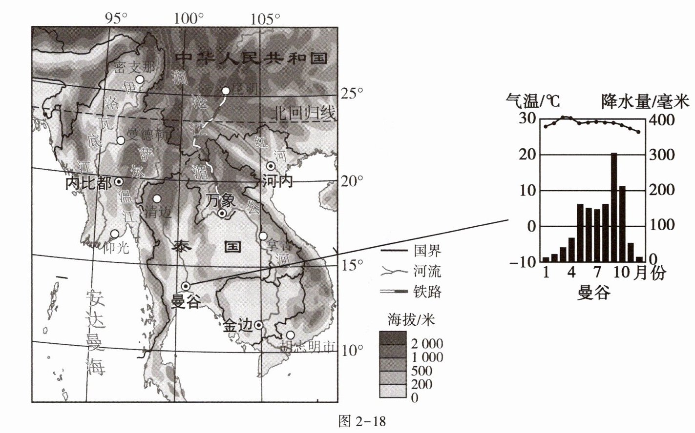 榴莲被誉为“水果之王”,深受我国消费者的喜爱。受气候条件影响,长久以来我国都需要从东南亚国家进口榴莲。图2-18为东南亚中南半岛地形示意图和曼谷气候资料统计图。