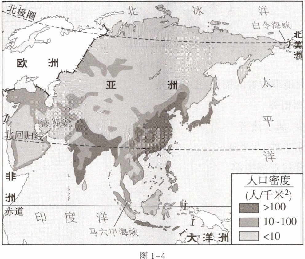 (1) 在图中圈出亚洲人口密度大于100人/千米$^2$及小于10人/千米$^2$的主要分布地区。