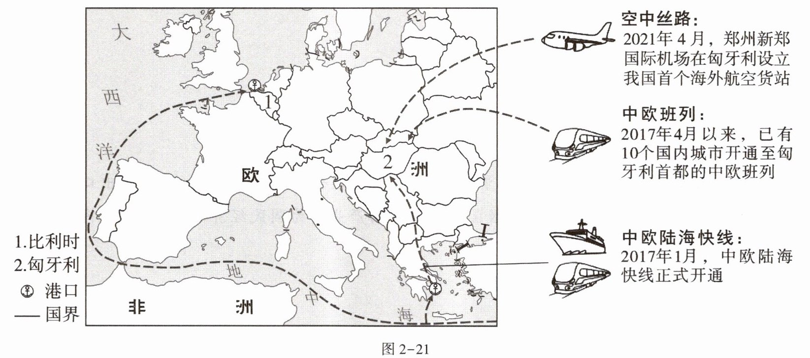 (3)匈牙利地处欧洲中部(或地处联系东西欧、沟通南北欧的“十字路口”);(中欧陆海快线、中欧班列、空中丝路等)交通便利(或实现海铁、陆空等联运)。