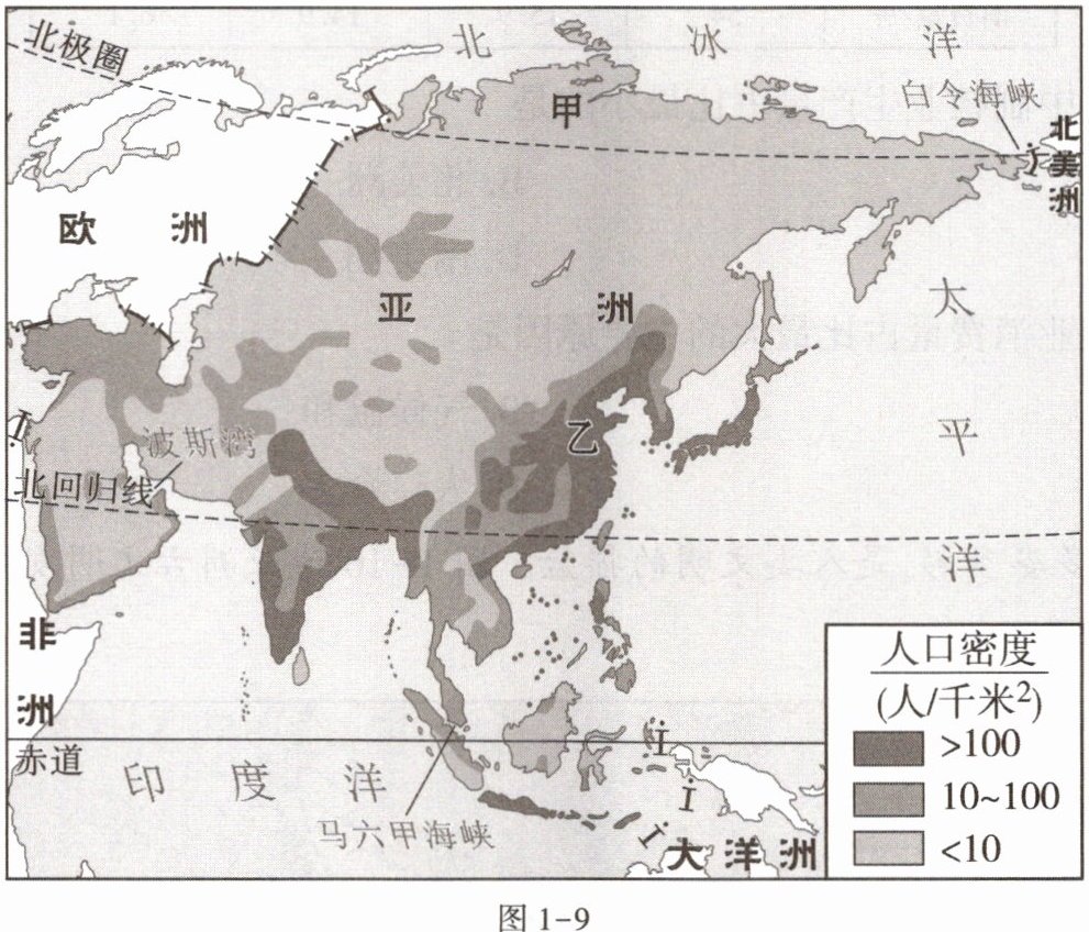 亚洲是世界上面积最广袤、人口最多的大洲,其人口分布不均,经济发展地区不均衡。图1-9为亚洲人口密度示意图。据此完成11~13题。