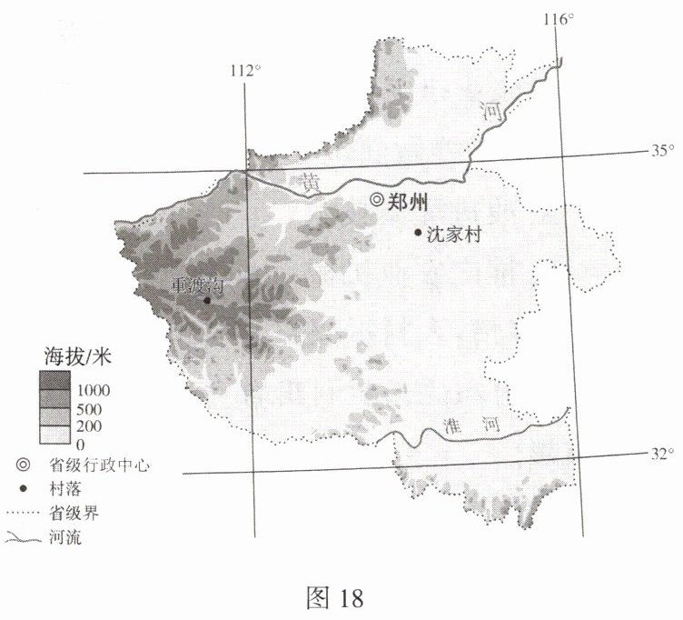 1. 河南省东西部存在自然环境差异,乡村振兴之路也有所不同。图 18 为河南省地形示意图。阅读图文材料,回答下列问题。