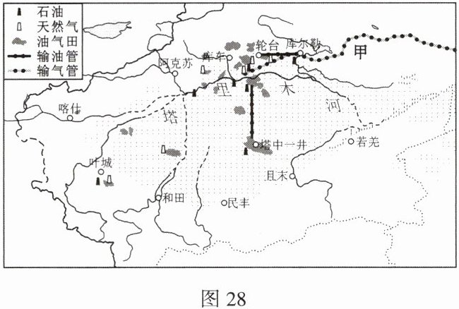 读塔里木盆地油气资源分布示意图(图28),回答5~7题。