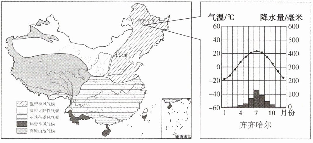 图1 中国气候类型分布示意图和齐齐哈尔气候统计图