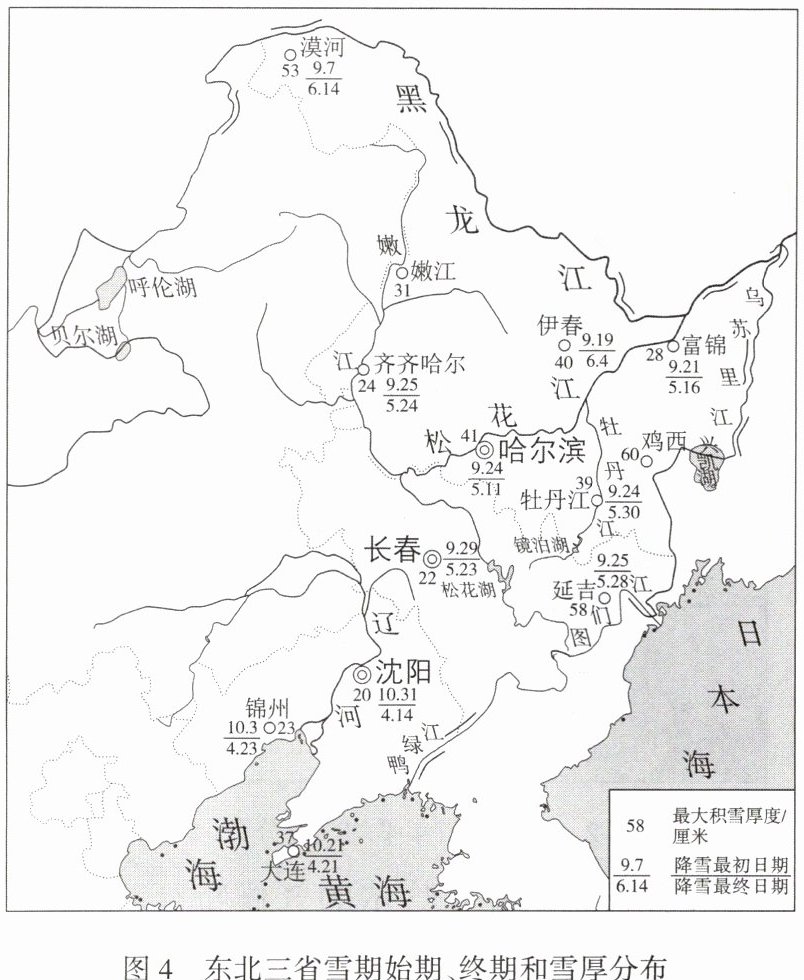 9. 在图4中找出“漠河”“齐齐哈尔”“沈阳”三个城市并估算这三个城市的雪期。其中雪期最长的是______,其次是______,最短的是______。由此可以归纳:东北三省的雪期变化规律是由______往______雪期变长。导致漠河比沈阳雪期长的主要影响因素是______。
