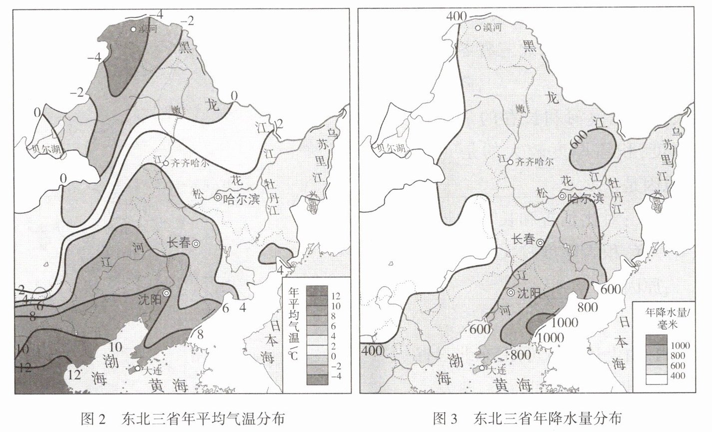图2 东北三省年平均气温分布 图3 东北三省年降水量分布
