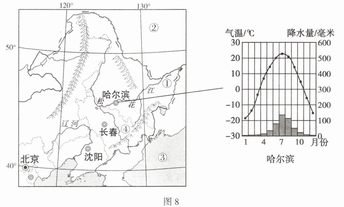 “让回忆冻结在昨天,轻轻悄无声地堆叠,就像东北的雪,那么不知又不觉,不知又不觉,覆盖了整个季节。”冬季的东北是冰雪的世界,哈尔滨的冰雕更是如幻如梦。图8为东北地区示意图和哈尔滨气候统计图。据此完成3~5题。