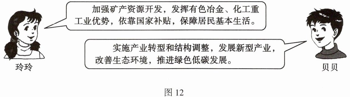 (4)东北三省因矿产资源开采而形成了一批工矿城市,经过多年开发,资源枯竭、环境污染以及生态恶化制约东北老工业基地发展。针对上述问题,在以东北振兴为主题的班级辩论会上,玲玲与贝贝有不同观点(如图12所示),根据“绿色发展、生态优先”高质量发展要求,你赞成的是______的观点。