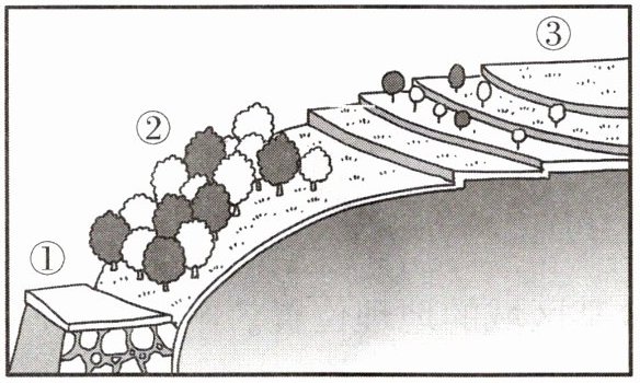 (4)①B ②A ③C 【解析】读图可知,陡坡水土流失最严重,适合退耕还林;缓坡水土流失较小,适合建梯田;坡脚地区适合建挡土坝。