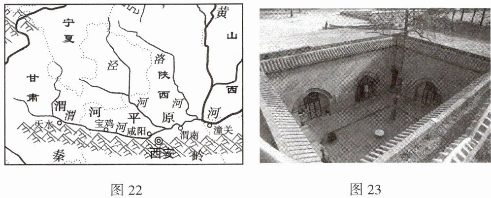 在高原相对平坦的地带,人们找不到开窑的山坡,于是发明了另类的窑洞——地坑院。修建地坑院时,人们先在平地上挖出方形的地坑,然后在地坑的四壁挖出窑洞。大多数人家的院中会栽一棵树,树冠冒出地面,以防外人不小心掉进地坑……图22为渭河流域示意图,图23为陕西咸阳市附近地坑院景观。