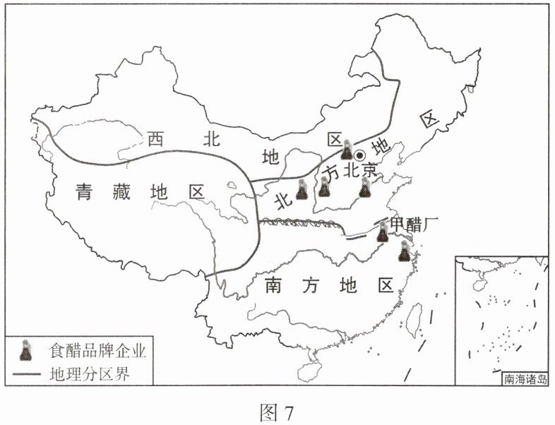食醋是一种常用的调味料,通常以粮食为原料。其中南方地区以大米为主,北方地区以高粱和小米为主。图7是我国部分食醋品牌企业分布示意图。据此完成3~4题。