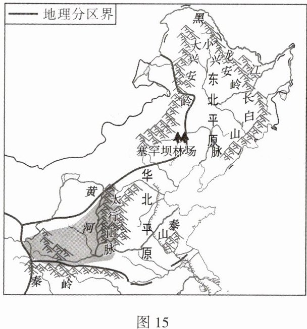 建好绿水青山,就有金山银山。位于河北省北部的塞罕坝林场就是生态文明建设的典型范例,三代塞罕坝林场人坚持植树造林,为京津地区建起了一道神奇的生态走廊。读我国北方地区示意图(图 15),完成 4~5 题。