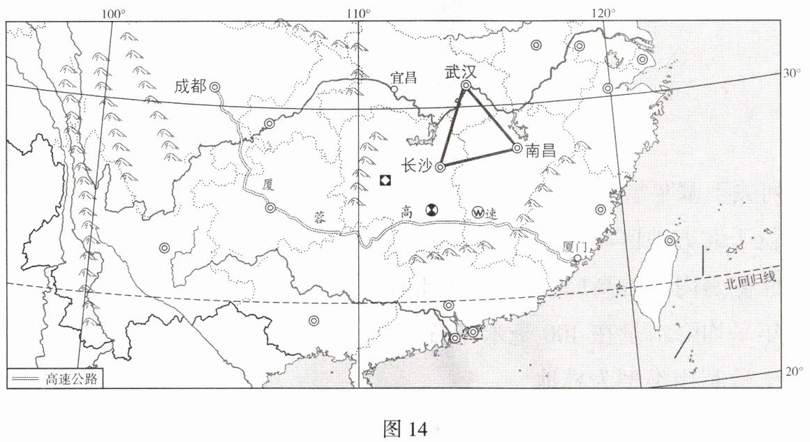 《沿着高速看中国》栏目组沿“厦蓉高速公路”(成都至厦门)进行拍摄。图 14 为厦蓉高速公路线路图。据此完成 1~3 题。