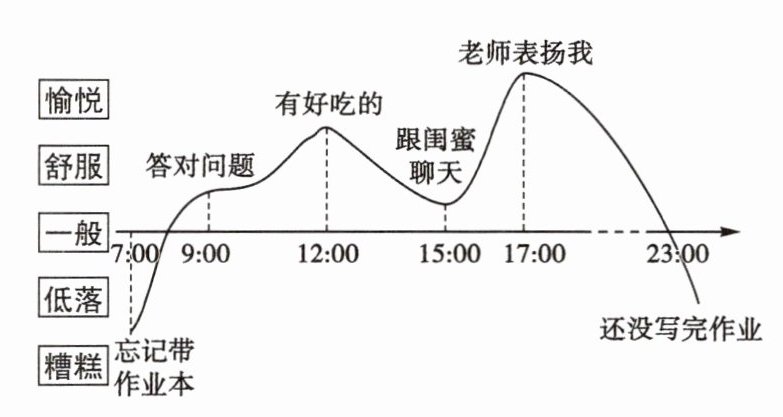 解:情绪是复杂多样的,会随着时间和事件的变化而变化。从图中可以看出,该同学一天的情绪有愉悦、舒服、一般、低落、糟糕等多种状态,这体现了情绪的多样性。同时,不同的事件(如答对问题、有好吃的、老师表扬、跟闺蜜聊天、忘记带作业本、还没写完作业等)会引发不同的情绪,说明情绪受多种因素影响,如个人的生理周期、对某件事情的预期、周围的舆论氛围、自然环境等。而且情绪不是一成不变的,它会随着情境的改变而变化。