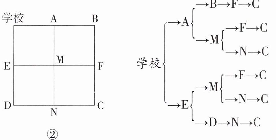 最近的走法就是:对东西向道路来说,只能从西向东走,对南北向道路来说,只能从北向南走,就是说,这些道路可理解为“单行道”。因为从学校到家,无论怎样走,都必须经过C点,所以可以先考虑从学校到C点共有几种走法。