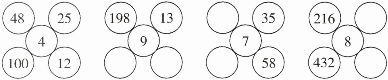 分析:由第一组数可知,48 = 4 × 12,100 = 4 × 25,斜着的三个数可以组成一个乘法算式,左上方和左下方的两个数是积,中间的数是两个乘法算式共同的乘数。