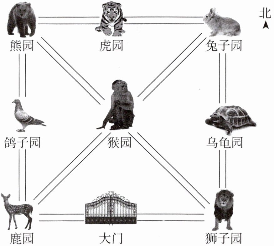 (2)先向西走到鹿园,然后向北走到鸽子园,再向北走到熊园。(答案不唯一)