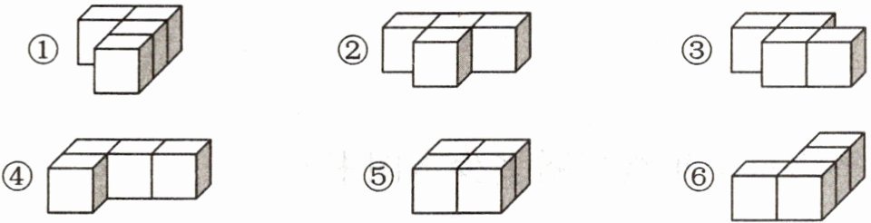 3. 小丽用同样大小的正方体搭出了下面的立体图形,根据要求,选择适当的序号填在下面的括号里。