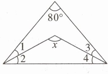 7. 下图是一个等腰三角形的玩具零件示意图,已知$∠1= ∠2$,$∠3= ∠4$,求x的度数。