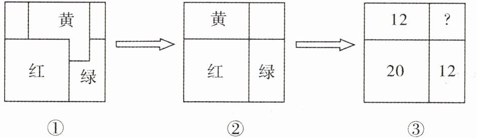 观察发现空白小长方形与红色正方形下面的长方形面积相等(因为红、黄、绿三张正方形纸片大小一样)。