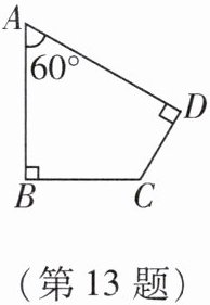 13. 如图,已知一块四边形草地ABCD,其中$\angle A= 60^{\circ}$,$\angle B= \angle D= 90^{\circ}$,$AB= 20m$,$CD= 10m$,求这块草地的面积.
