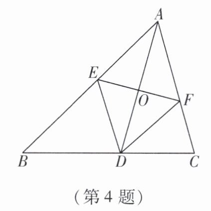 4. 如图,$AD$ 是 $△ABC$ 的角平分线,$DE // AC$ 交 $AB$ 于点 $E$,$DF // AB$ 交 $AC$ 于点 $F$,且 $AD$ 交 $EF$ 于点 $O$,则 $∠AOF$ 为 (