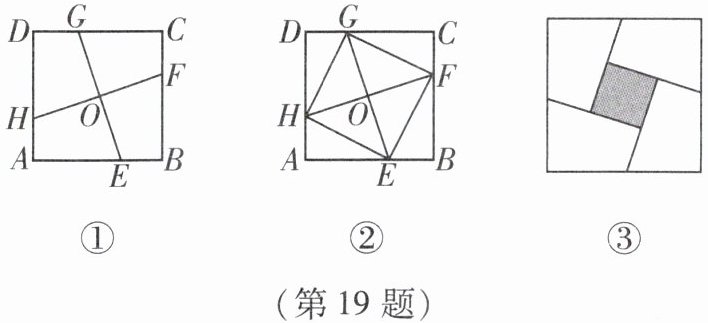 19. 如图①,在正方形 $ABCD$ 中,$E$,$F$,$G$,$H$ 分别为 $AB$,$BC$,$CD$,$DA$ 上的点,$HA = EB = FC = GD$,连接 $EG$,$FH$,交点为 $O$.